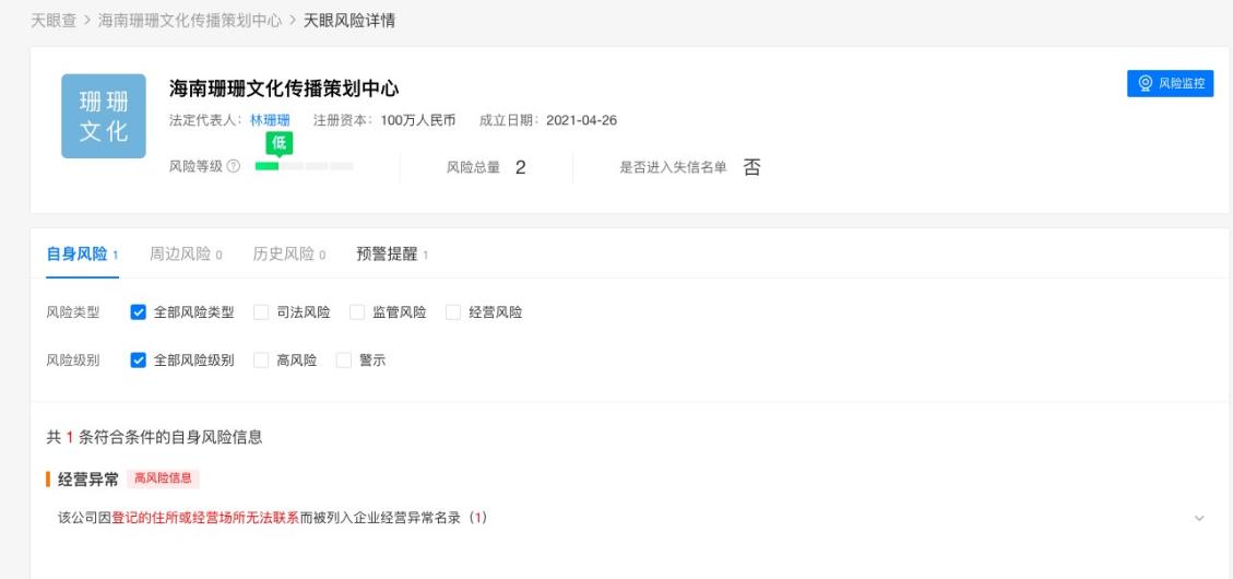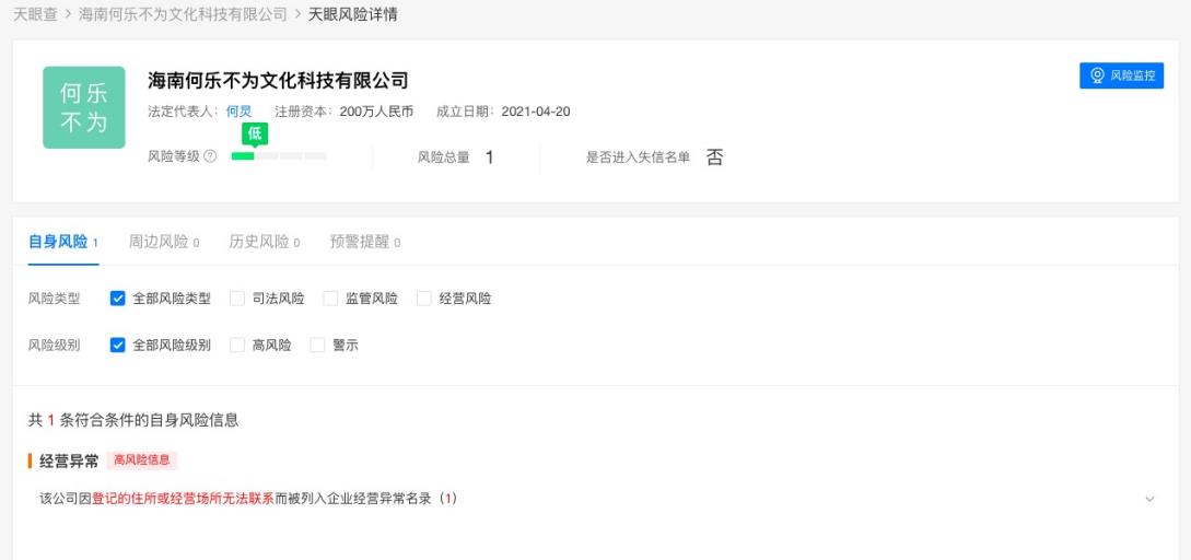 在此次摸清行动中,界面海南发现亦有多家网红及明星在海南注册的企业因“通过登记的住所或者经营场所无法联系”而被列入经营异常。界面海南通过天眼查App发现,在列入经营异常的网红明星中,不仅有因偷税漏税而频上热搜的网红林珊珊个人独资企业的海南珊珊文化传播策划中心,亦有湖南卫视知名主持人何炅出资的海南何乐不为文化科技有限公司,演员魏大勋间接持股99%的海南恒立影视文化传播有限公司,演员江一燕与钟文玉共同持股的爬行者文化创意(海南)有限公司等。