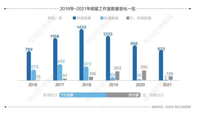 据每日经济新闻和万达影视集团大数据中心出品的电影产业白皮书《2021强影之路》(下文简称:“白皮书《2021强影之路》”)数据显示,清朗行动背后,一些明星工作室或相关企业已陆续注销,2021年明星相关企业累计注销超400家。