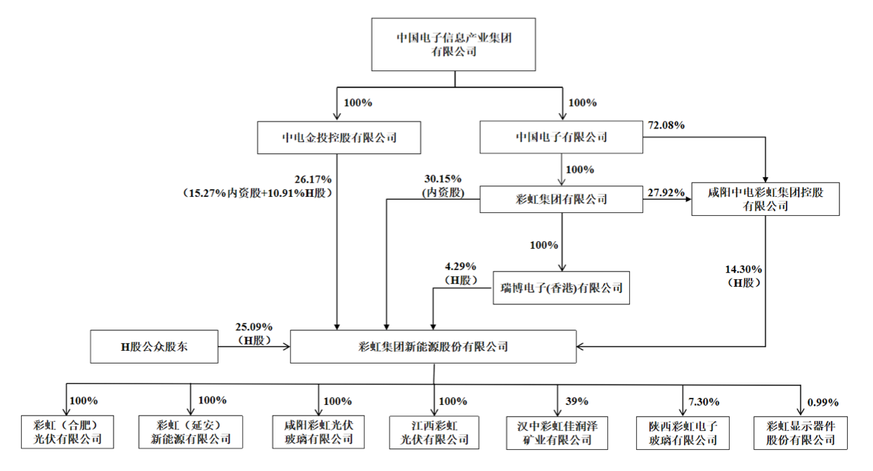 IPO前,控股股东彩虹集团(SS)直接持有公司30.15%的股权,并通过瑞博电子间接持有公司4.29%的股权(H股),合计持股34.43%;实控人中国电子通过彩虹集团、瑞博电子(CS)、中电彩虹(SS)及中电金投(SS)合计持有公司74.91%的股权;此外H股公众股东持有25.09%的股权。