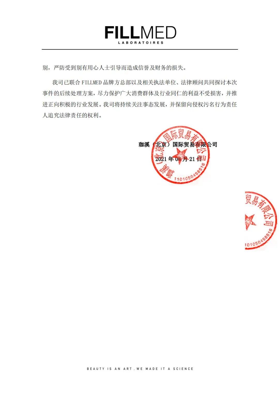 2021年8月21日,法国FILLMED菲欧曼(原Filorga菲洛嘉)的中国独家经销商——珈溪(北京)国际贸易有限公司,在官方微信公众号“FILLMED菲欧曼”发布声明,表明菲洛嘉(北京)医疗器械有限公司及其销售的红盒装“Vitalorga菲洛嘉”注射用交联透明质司酸钠凝胶,与法国FILLMED菲欧曼无关。