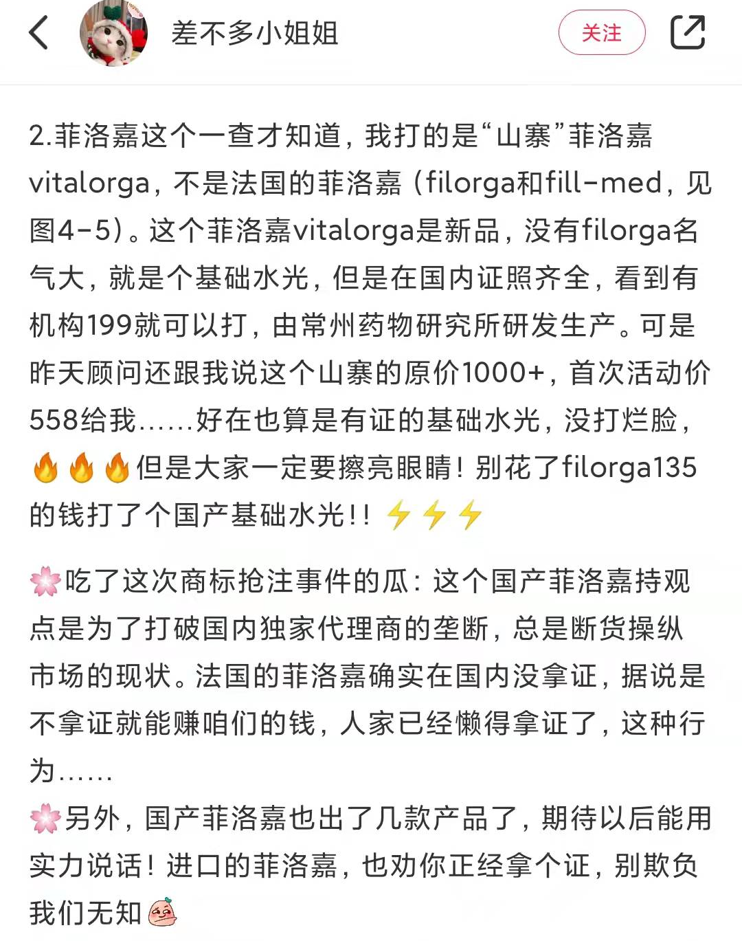 老拿成分说事显得上纲上线,最终还是得用效果说话。但记者发现,这两款产品在多个医美社区并无直接使用效果对比。主要原因是资深医美消费者,基本上会直接选择价格较高的法国Filorga,而小白医美消费者虽冲着“菲洛嘉”的名声去,但一部分人会被诱导(美容顾问以促销为由推荐)使用看似便宜的国产Vitalorga。