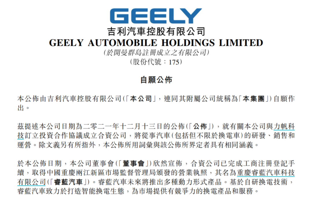 近日,吉利汽车在港交所发布公告称,其与力帆集团共同组建的合资公司——重庆睿蓝汽车科技有限公司(下称“睿蓝汽车”)已完成工商注册登记手续,并正式落户于重庆市两江新区。