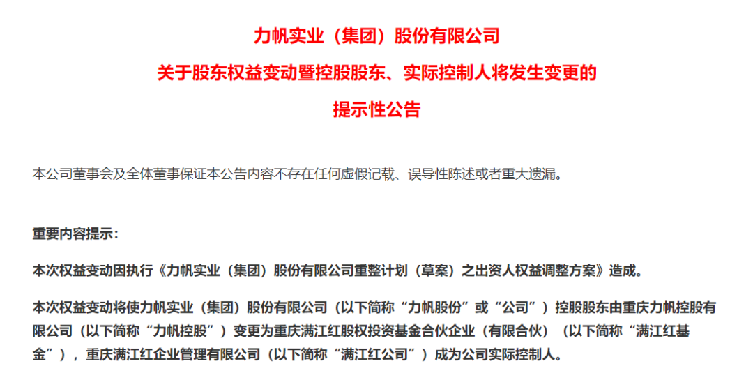 2020年12月22日,已经历5个月的破产重整后,伤痕累累的力帆发布公告表示,力帆股份控股股东由力帆控股变更为重庆满江红股权投资基金合伙企业(下称“满江红基金”)。