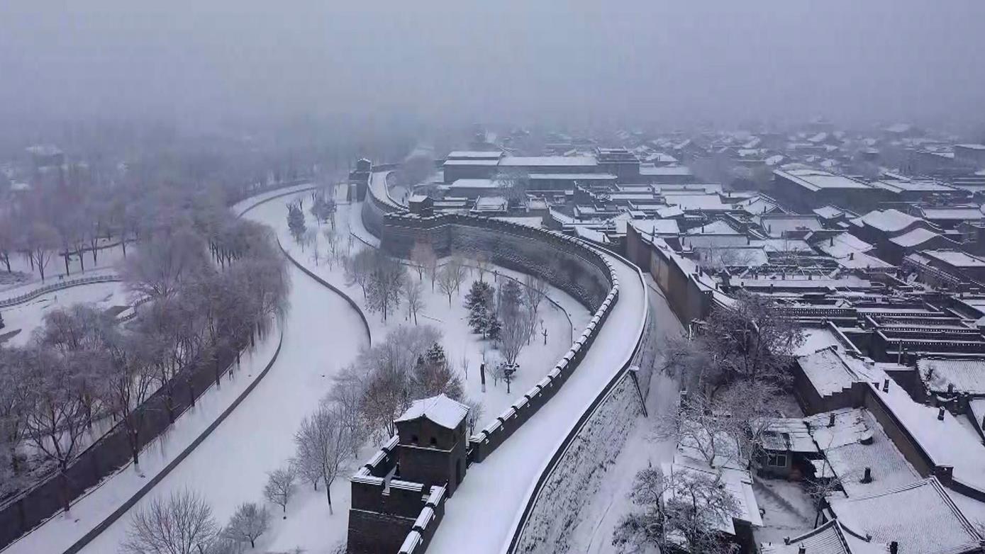 △2022年1月24日,平遥迎来降雪天气,整个古城的轮廓被银白笔墨勾勒出来。(总台央视记者 范凯拍摄)