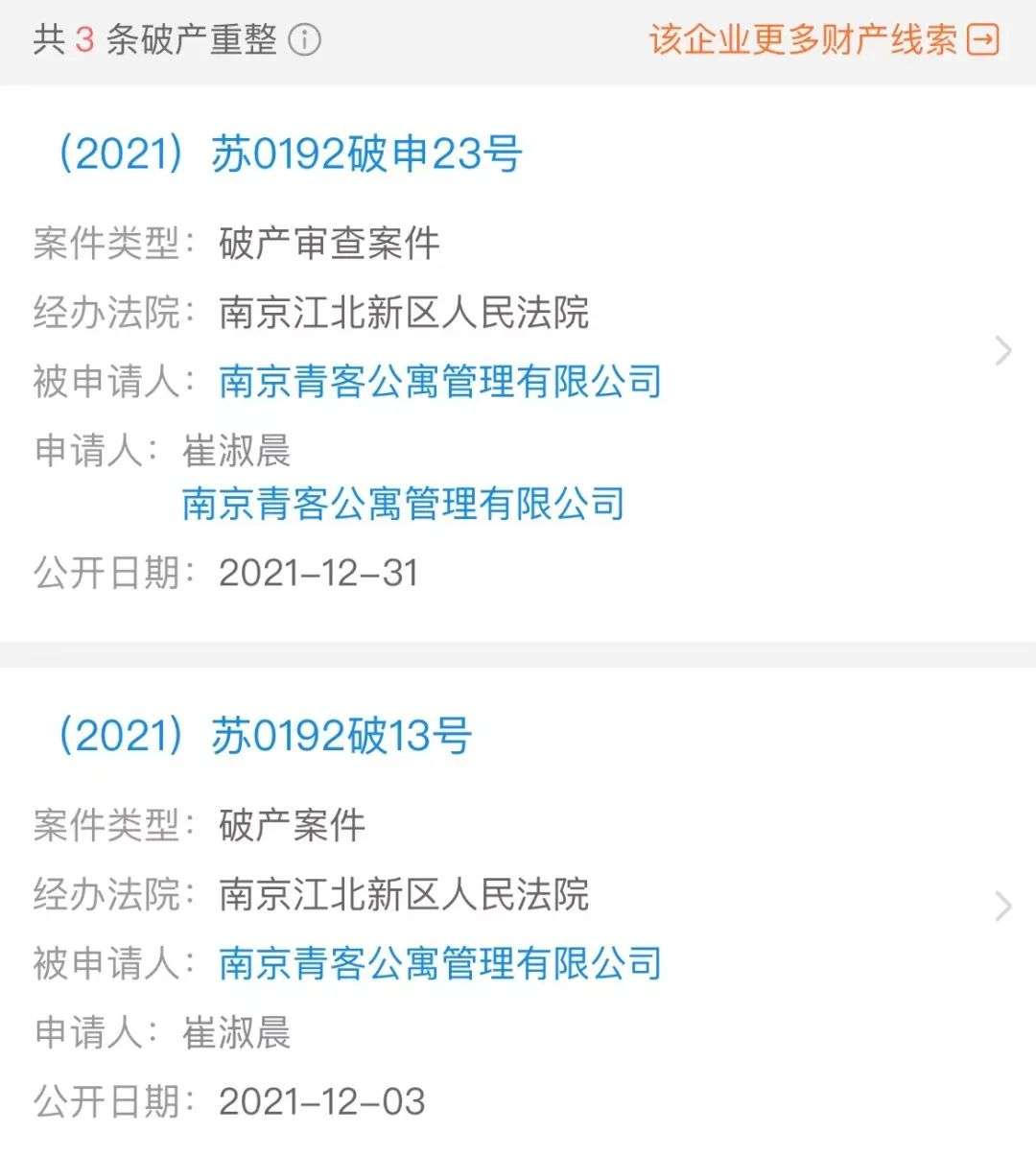 这并非青客旗下公司第一个破产清算的案子。2021年12月,南京青客公寓管理有限公司被当地法院执行破产清算;苏州青客信息科技有限公司也被个人与银行申请破产清算,后被驳回。