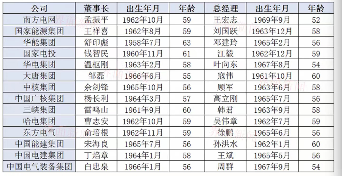 2025年,华能集团总经理邓建玲、中国广核集团总经理高立刚、东方电气总经理徐鹏、中国电建集团总经理王斌,都将满60周岁。若无升迁,即面临退休。