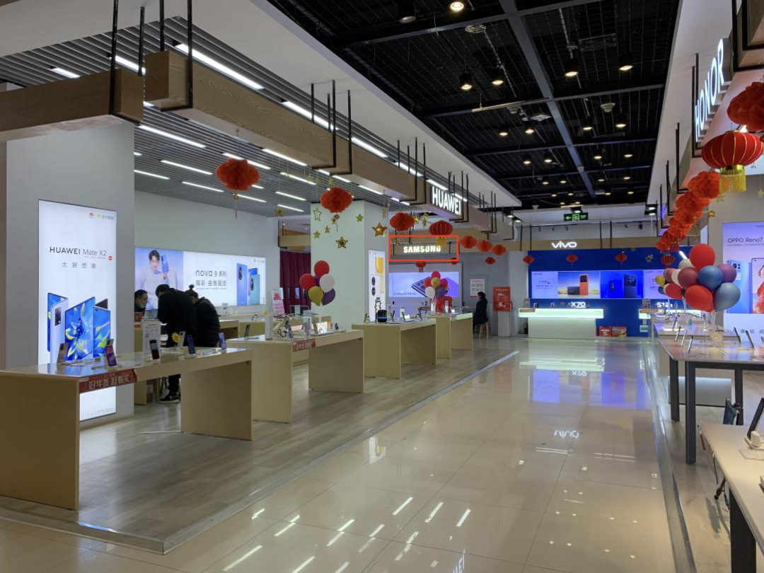 进入卖场,发现三星手机处于一个角落的位置,相比旁边的华为与荣耀专柜,着实有些寒酸。单单从感官上看,颇有点边缘化的意思。