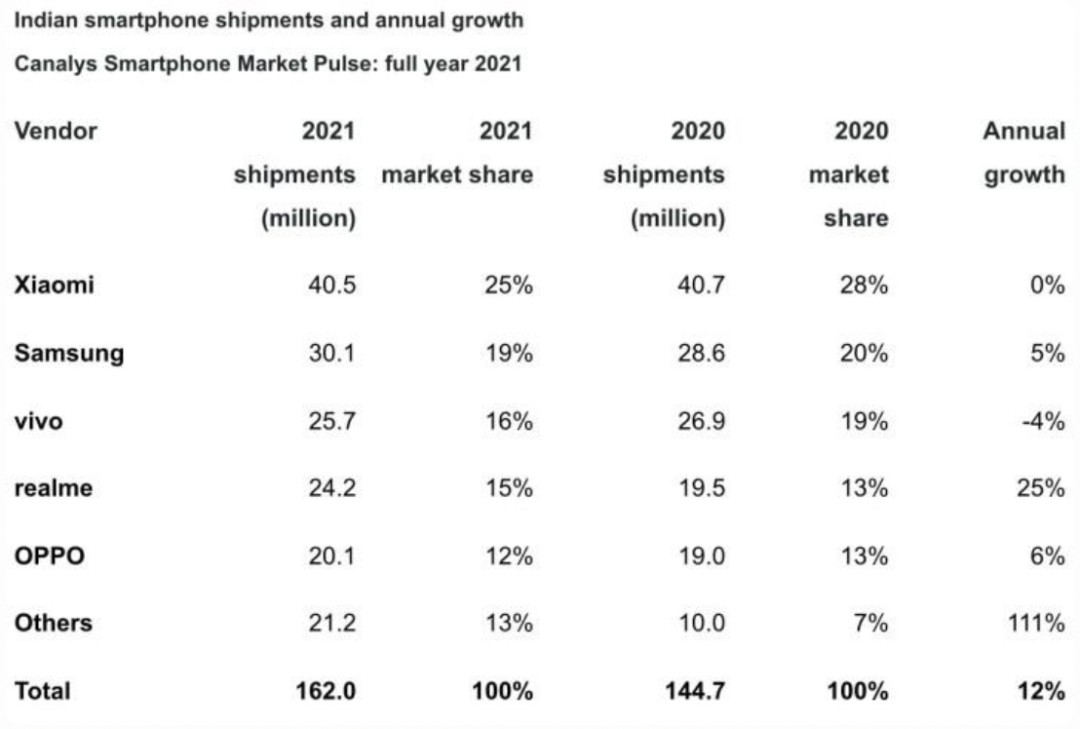 据Canalys的数据显示,2021年,小米以25%的市场份额稳坐印度市场第一,三星以19%的市场份额位居第二,vivo、realme、OPPO分别以16%、15%、12%的市场份额紧随其后,这五大品牌已经占据了印度市场87%的市场份额。