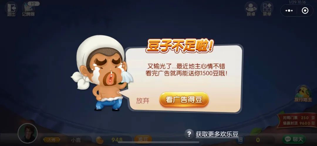 曾经也会有人在我长时间不回消息的时候发来一句:“你在干嘛呀?输豆豆吗?”好笑!我是会赢的!我并不只是在输豆豆!上个月在会议室开选题会,拿过坐在旁边的发哥(@张友发)的手机,我给他赢了十万豆豆(因为他是新人,系统分配的牌贼好,当然也有一些我的技术原因啦),我充分意识到,我是有斗地主天赋的。