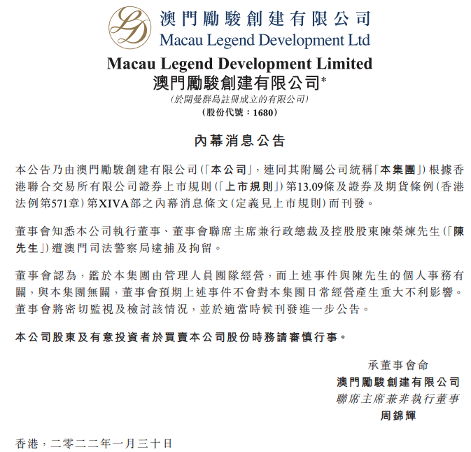 澳门励骏1月30日晚间在港交所公告,董事会知悉本公司执行董事、董事会联席主席兼行政总裁及控股股东陈荣炼先生遭澳门司法警察局逮捕及拘留。董事会认为,鉴于本集团由管理人员团队经营,而上述事件与陈先生的个人事务有关,与本集团无关,董事会预期上述事件不会对本集团日常经营产生重大不利影响。董事会将密切监视及检讨该情况,并于适当时候刊发进一步公告。