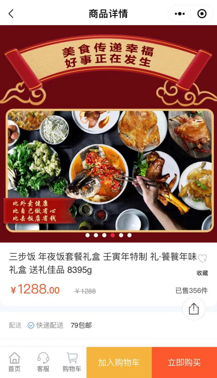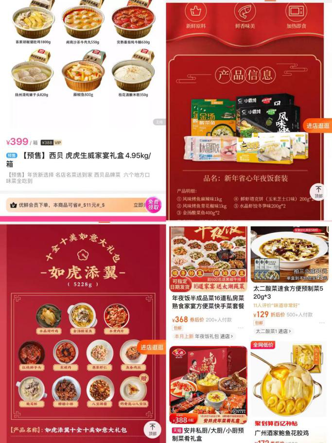 在国联水产淘宝旗舰店,其中不乏“新年省心年夜饭套装”,包括“风味烤鱼”“水晶虾饺”等半成品菜肴;在刚获得B+轮融资的预制菜品牌“珍味小梅园”淘宝旗舰店,其预制年夜饭礼盒“如虎添翼十全十美如意大礼包”包含11道预制菜,新品尝鲜价为288元。