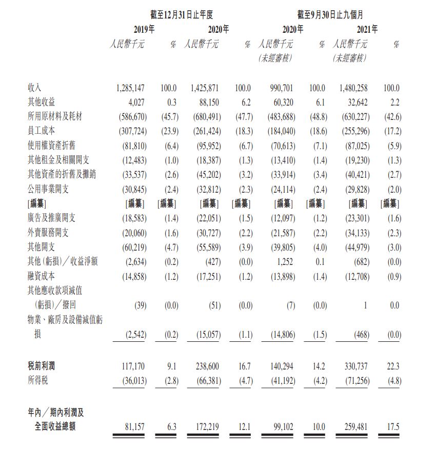 首先是营收和利润。2019年12月31日-2020年12月31日,七欣天的营收分别为人民币12.85亿元、14.26亿元,同期净利润为8115.7万元和1.72亿元;2021年上半年(截至9月30日止),七欣天的营收及净利润数据分别为14.8亿元、2.59亿元。此外,七欣天的净利率也在2020年实现大涨,从2019年的6.3%增至12.1%,再增至2021年的17.5%。