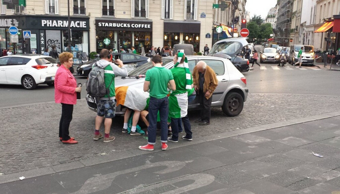 除了如印度电影般唱歌跳舞外,爱尔兰球迷的有爱之处还体现在很多方面。看到一对老夫妇的汽车抛锚,他们会自告奋勇地在路边帮忙换胎,而当时这位换胎的球迷身上还披着爱尔兰国旗。遇到街头有球迷斗殴,他们甚至用歌声来劝架并自嗨:“Stand up for the boys in Green(为了绿衫军爱尔兰都站起来), Sit Down for the boys in Green(为了绿衫军爱尔兰都坐下来)”。