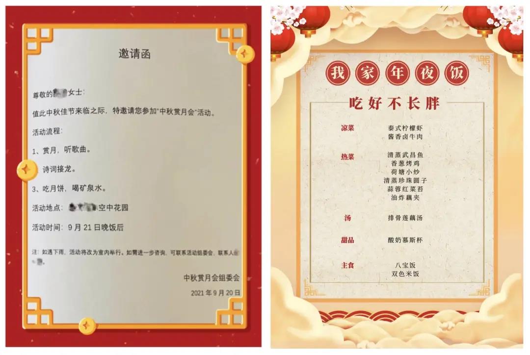 妙妙家的中秋赏月邀请函(左)和年夜饭菜单(右)受访者供图