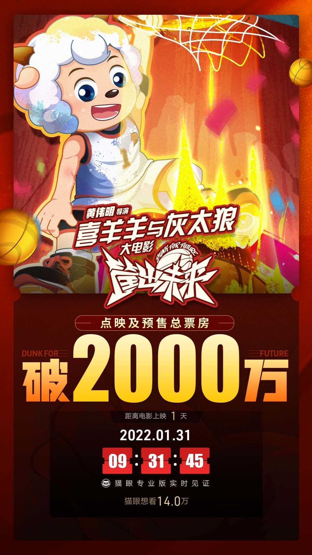 据@猫眼专业版 微博消息,1月31日09:31:45,《喜羊羊与灰太狼之筐出未来》点映及预售总票房破2000万。