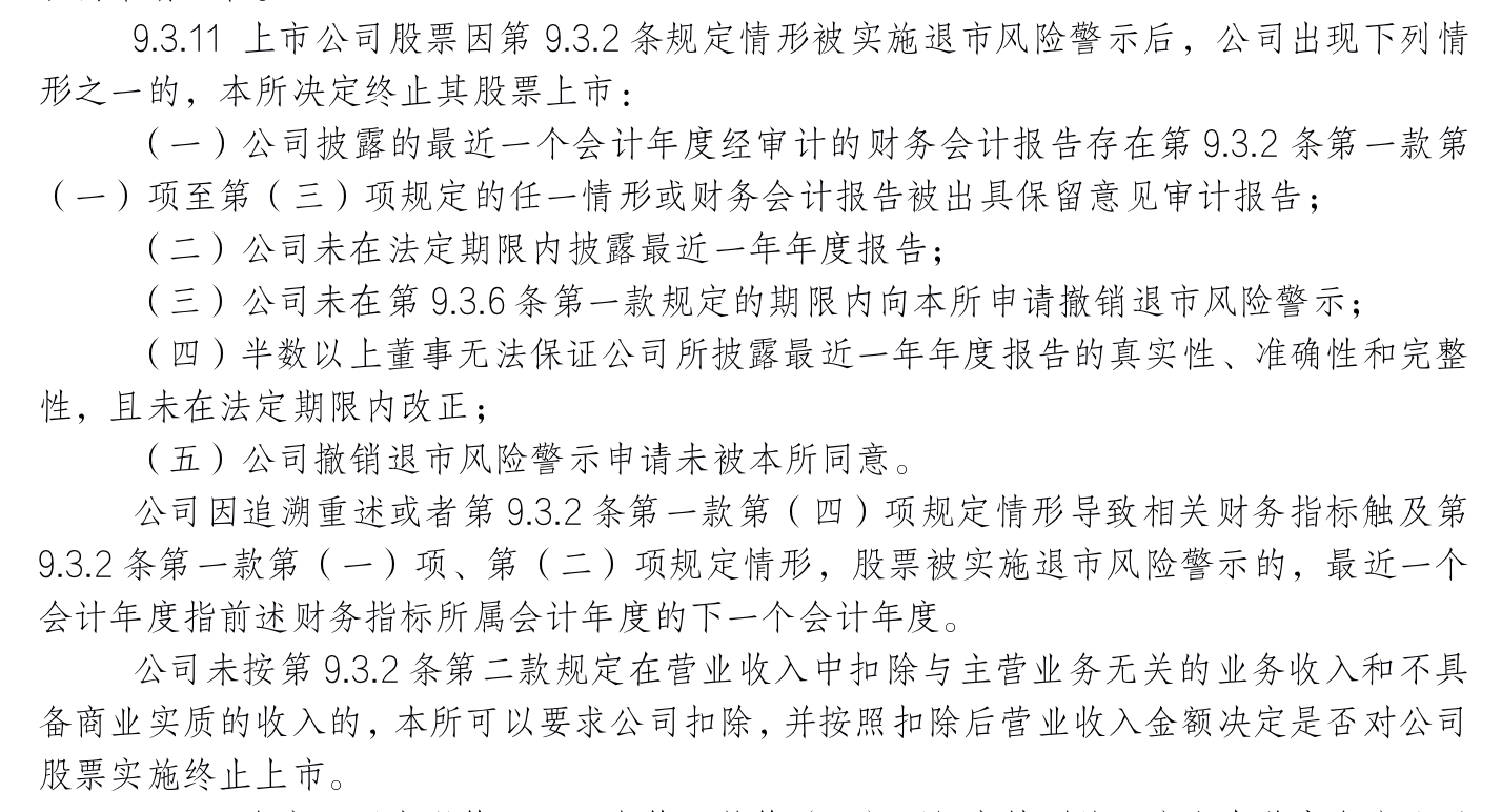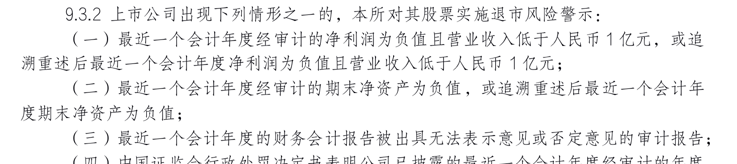 至于《上海证券交易所股票上市规则》(2022年1月修订)第9.3.11条规定,则包括了财务会计报告被出具保留意见审计报告、最近一个会计年度经审计的期末净资产为负值等。