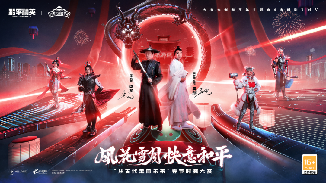 此次邀请到的吴彤和梁龙两位演唱者,本身便是传统民乐和中国摇滚各自领域的领军人物。同时在歌词上,《吉时到》也将穿越古今而带来的碰撞感充分展现。穿梭千载,寻踪烟火人间,集齐风花雪月,一同在吉时赴宴。两位风格截然不同的歌手同台高歌,摇滚与民乐交相融合,却形成了一种奇妙的和谐共振,似是 “风花雪月”的浪漫之于《和平精英》的冒险世界。