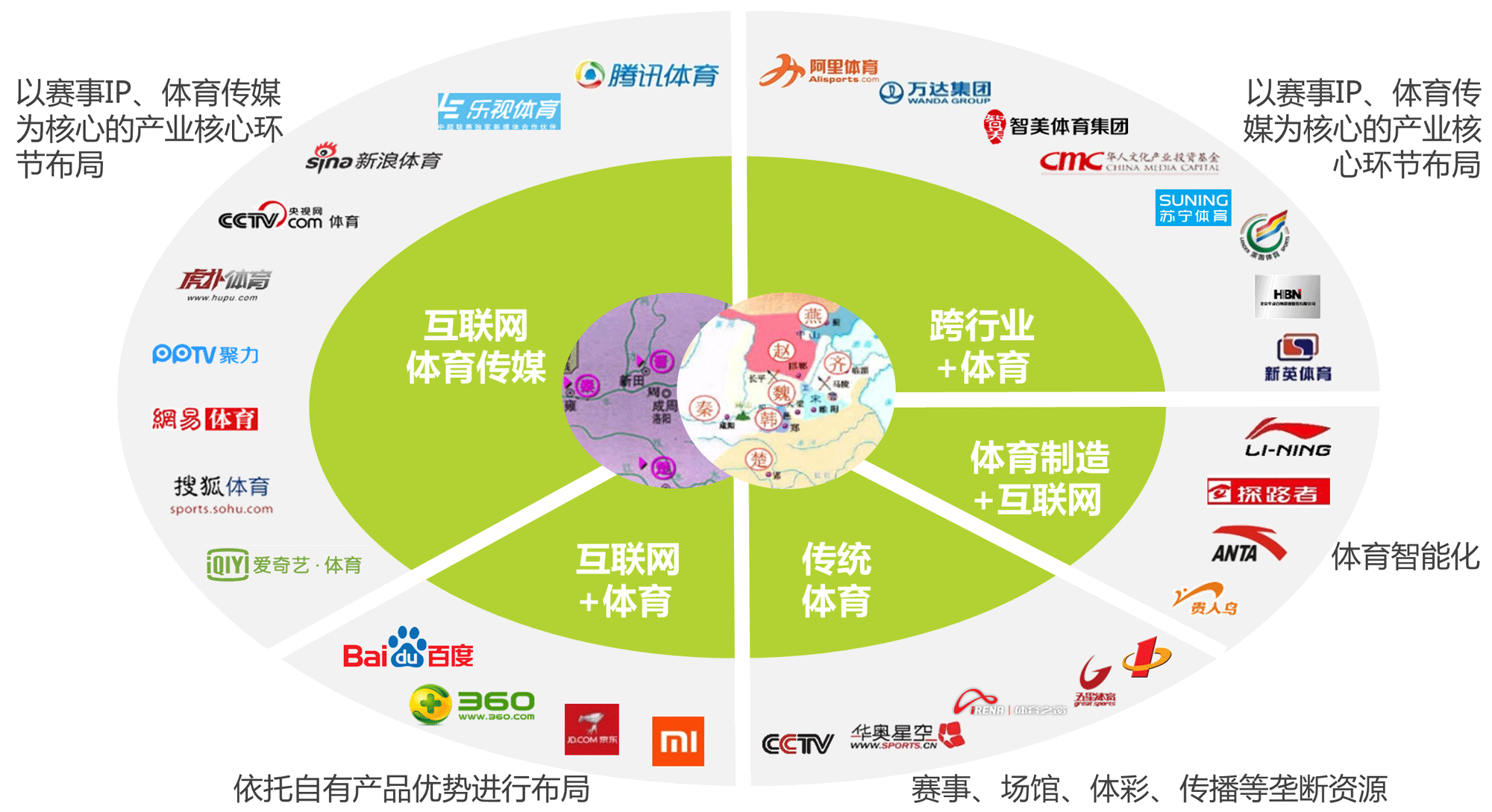 各企业从自身优势出发,布局赛事、传媒、智能体育等产业核心环节,并将体育业务与自有其他产品体系形成有效联动,初现“春秋五霸”、“列国七强”竞争态势。