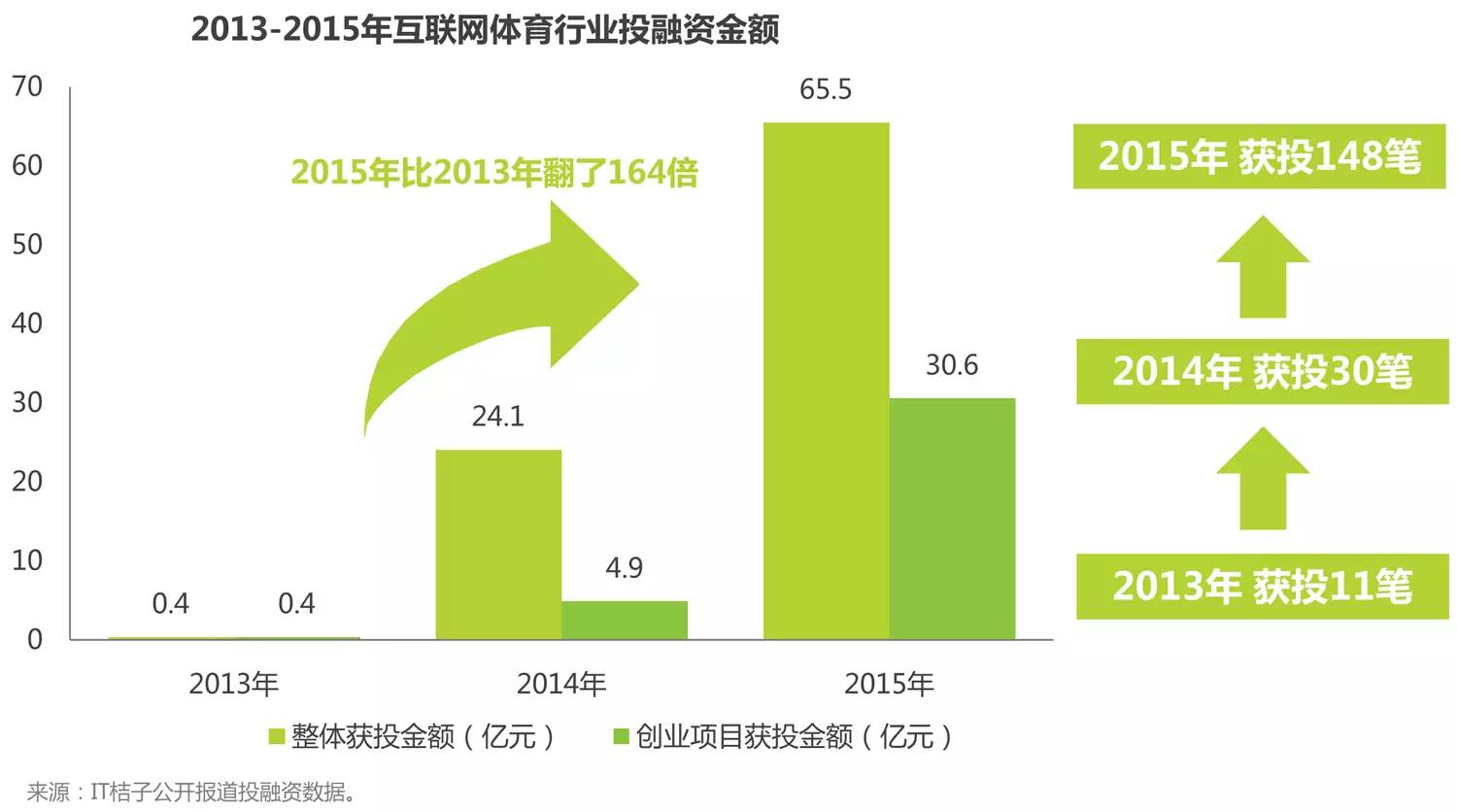2015年,体育行业整体获投金额超65亿,是2014年2.7倍,比2013年翻了164倍。