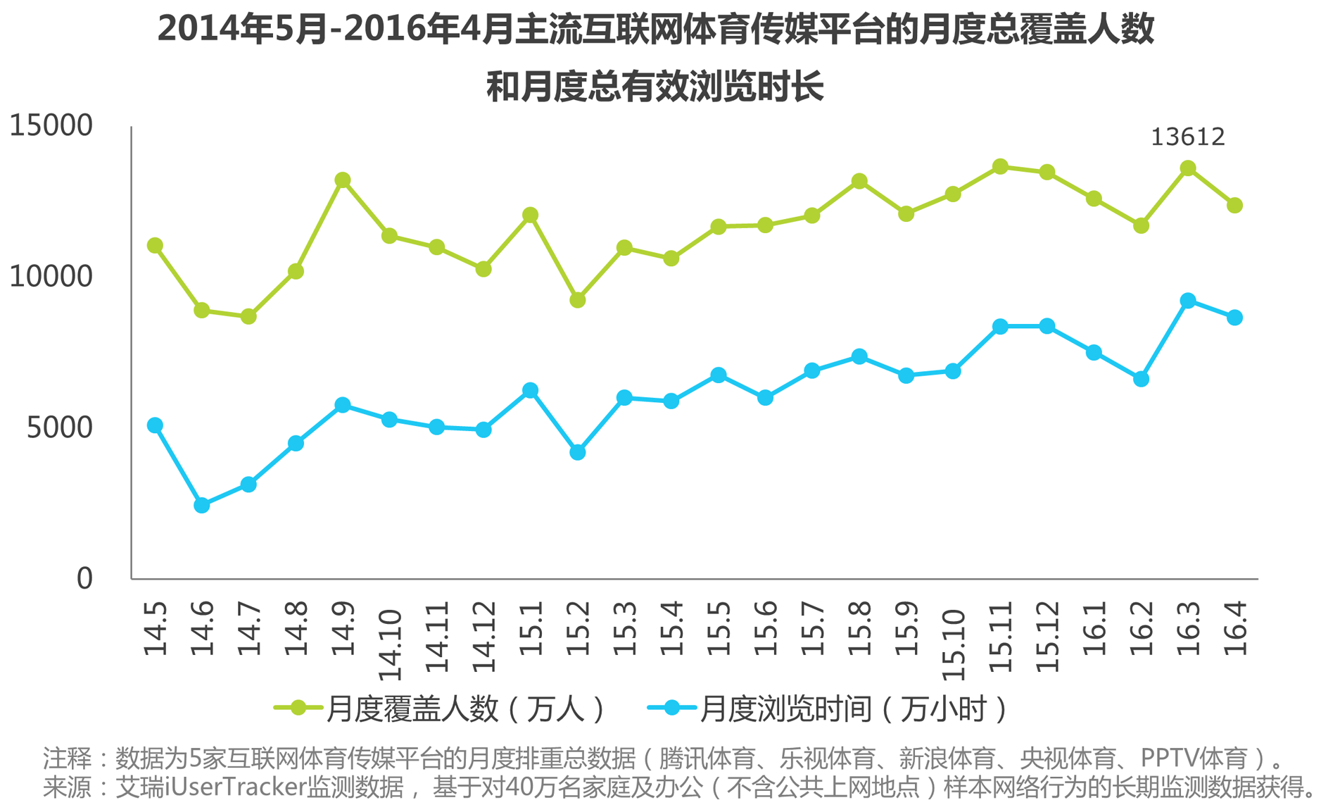 主流互联网体育平台的月度覆盖人数和月度总有效浏览时间总体呈现上升趋势。