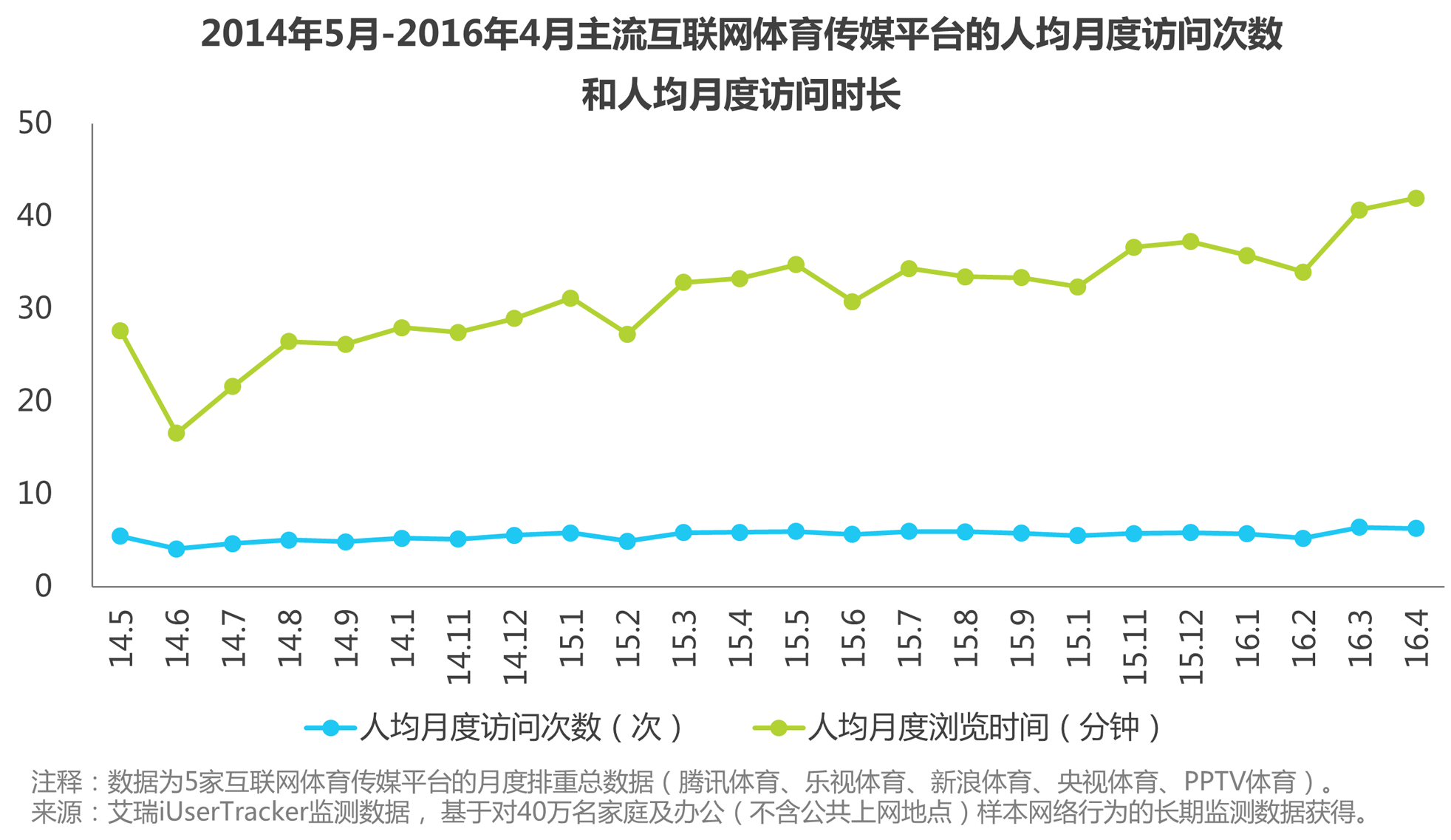 主流互联网体育传媒平台的人均月度访问次数和人均月度访问时长保持持稳上升趋势。
