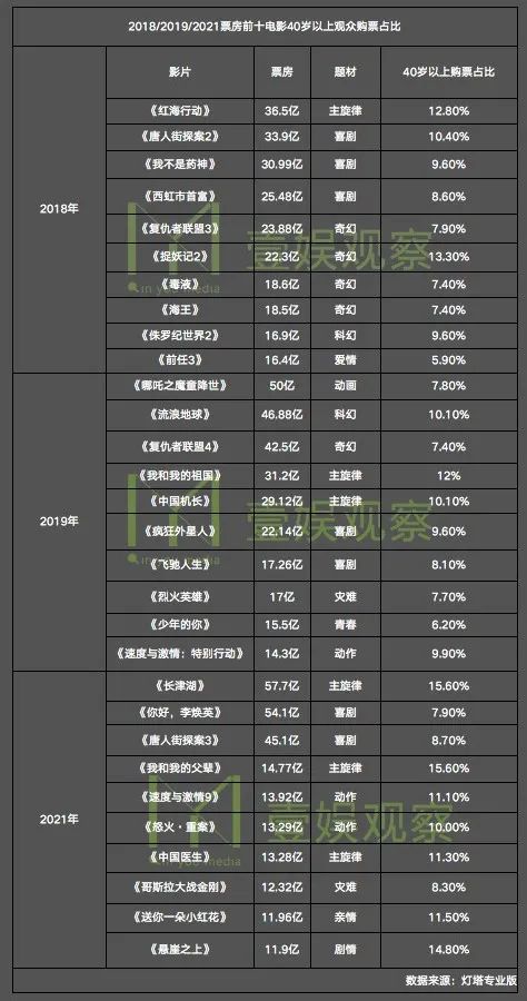 2021年,票房前十影片40岁以上观众购票占比超过10%的影片共有7部,而2018、2019年仅为3部。