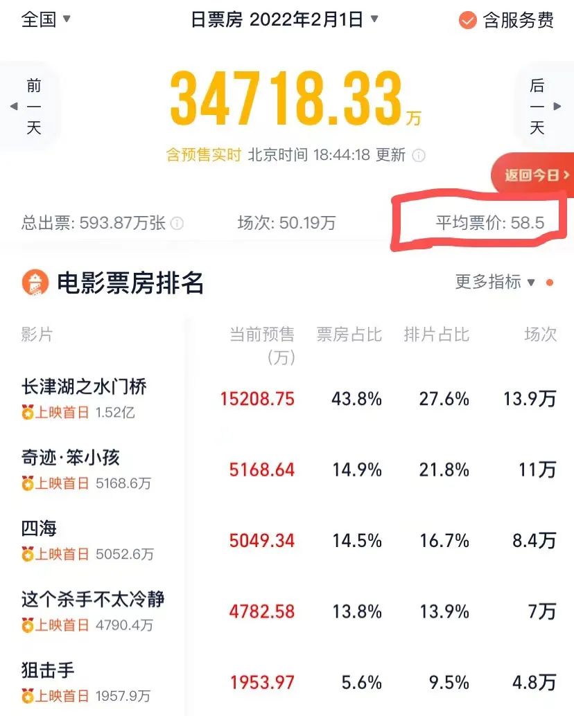 除了预售之外,今年春节档还需要面临比去年更为多变的全国各地疫情起伏,再加上高票价如约而至,目前2月1日(年初一)的平均票价为58.4元,相较2018年同期增长接近一倍。