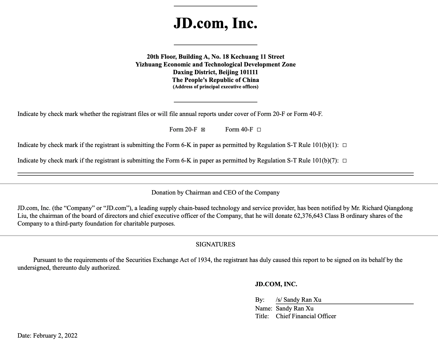 京东集团2月2日公告,已收到董事局主席兼首席执行官刘强东的通知,他将向第三方基金会捐赠62,376,643股公司B类普通股用于慈善目的。