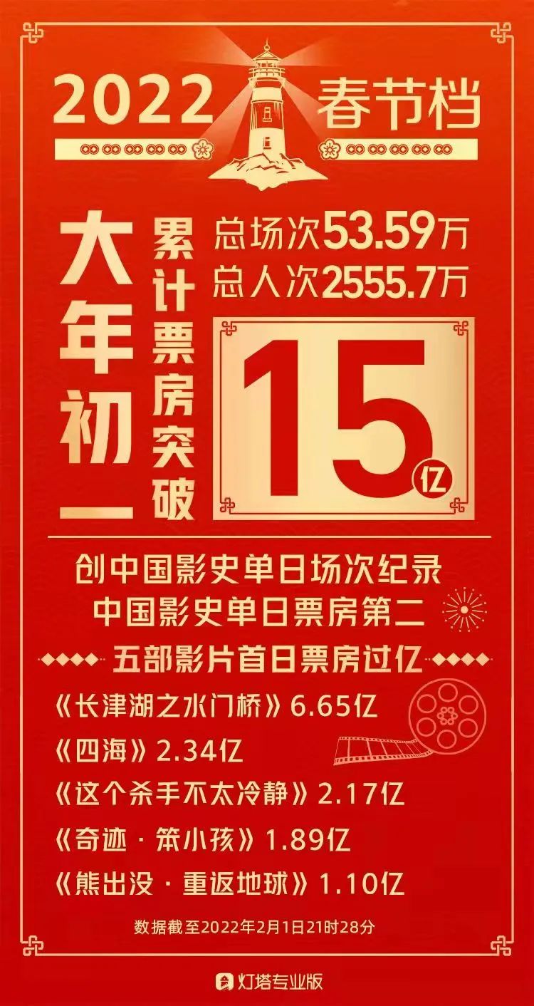 昨日大盘以15.08亿的成绩收官,位列史上第二,虽然相比去年的17.36亿,下滑了13.2%,但去年初一有相对特殊性:前年疫情春节期间影院关门,新片和观众积攒的过年看电影热情于去年春节爆发,才有了史上最火爆的春节档。而如果与疫情前2019年初一的14.58亿相比,今年的表现基本持平,甚至可以说,在今年仍然有局部疫情爆发、影院存在小范围关门歇业的情况下初一的票房成绩并未受到很大的影响。