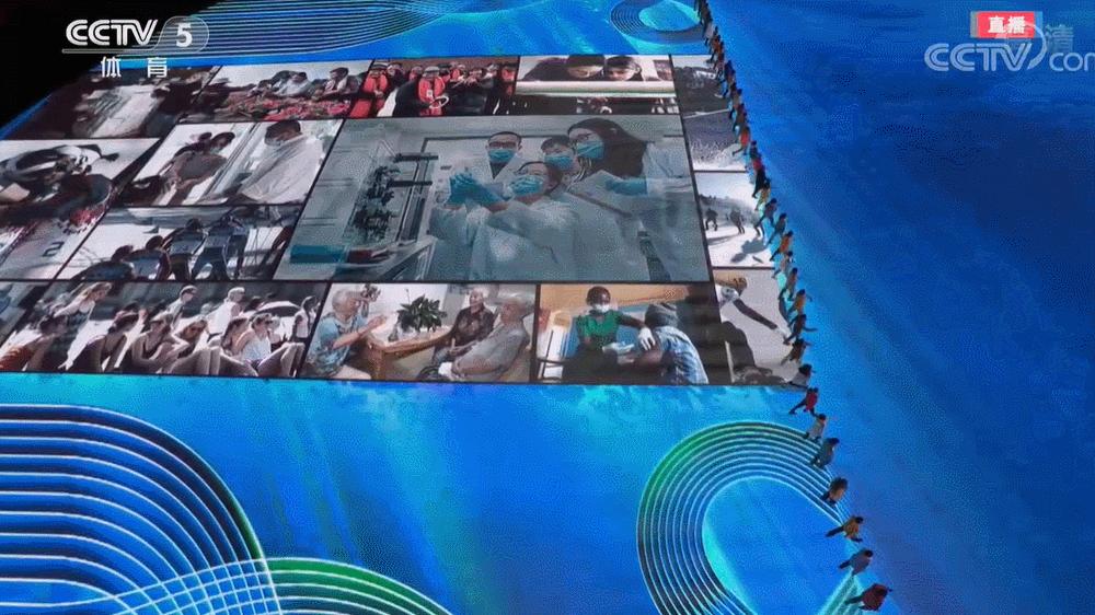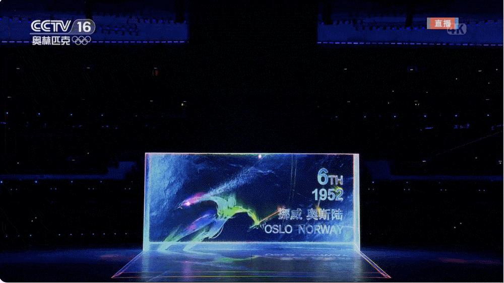 最后显示的是北京冬奥会的名字,这时出现6位冰球运动员,他们挥动冰球杆将虚拟冰球击向冰立方。