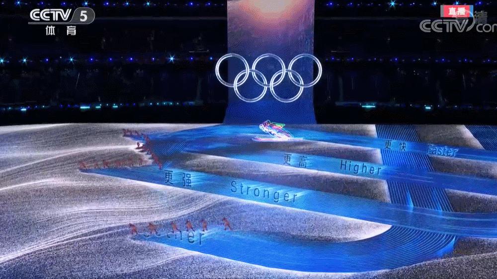 随后,四组滑雪运动员在场地上滑出浪波,“更快、更高、更强、更团结”这一奥林匹克格言在长长的滑冰轨迹上逐渐呈现。通过搭载京东方自主研发的超大规模显示模组控制与同步系统,地面可实时捕捉演员行进轨迹。