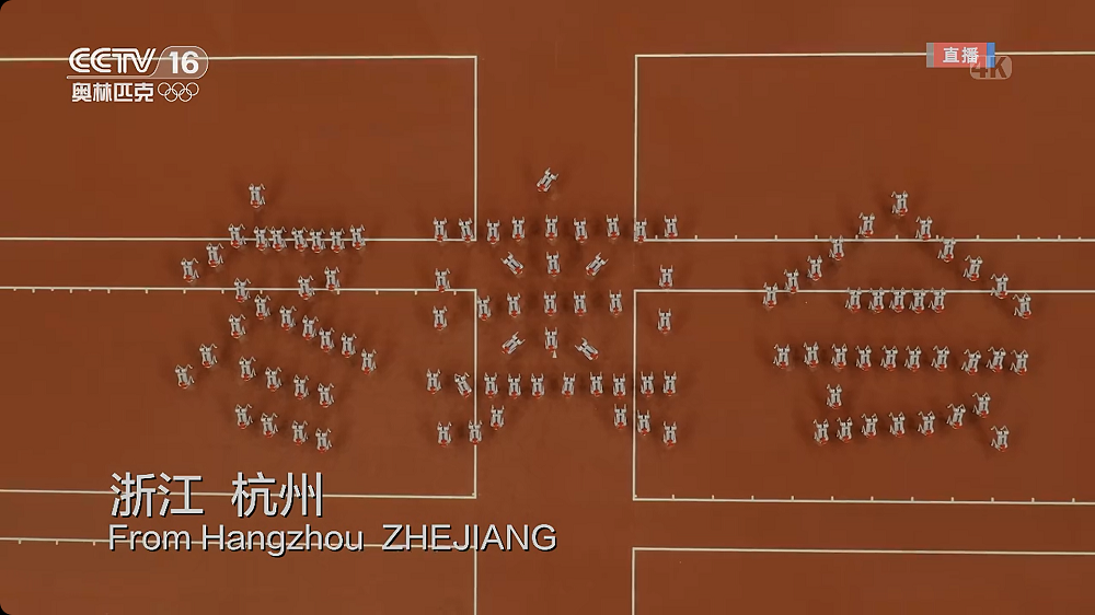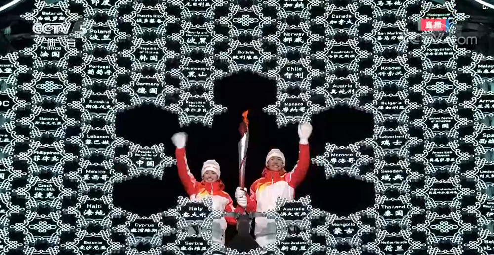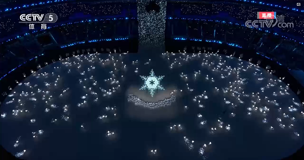 每个国家或地区的代表队入场时都有一个雪花形状的引导牌,在中国代表队入场后,引导员手拿雪花引导牌汇聚在一起,此时虚拟的雪花也开始显现。