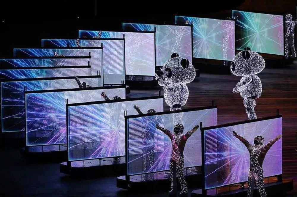 “北京8分钟”中有近乎透明的LED屏幕“冰屏”实现了透明图像显示,达到了更通透灵动的效果,肉眼看上去雪花洁白、冰花透明;有24个移动机器人通过自己动作编排,实现了与现场演员、地面投影的联动表演。“北京8分钟”还有两只灵活进行滑冰表演的熊猫木偶,外部装有外挂摄像头和云台,内部演员佩戴增强现实智能眼镜,使演员在大熊猫道具内部无差别的观测到外部的环境,完美流畅的完成规定动作。