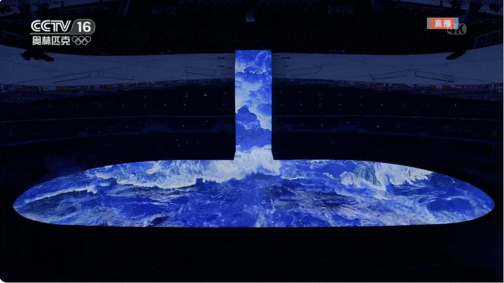 在国旗入场和奏国歌环节之后,现场竖屏上,一滴冰蓝色的水墨从天而降,它幻化成黄河之水,倾泻而下,整个场地都奔腾着滚滚而来的黄河之水。