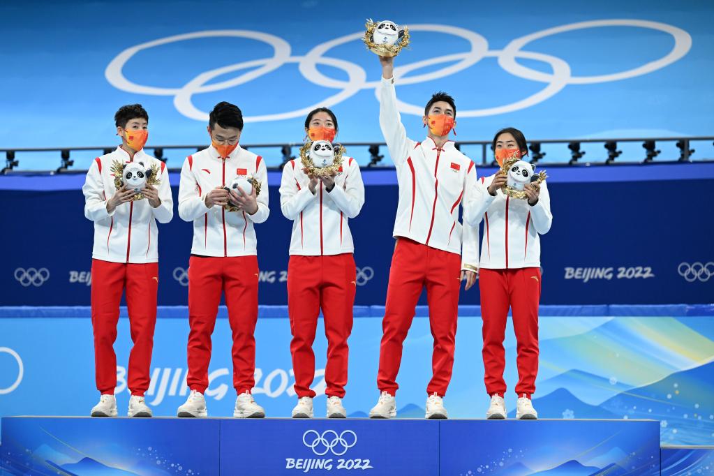 2月5日,中国队选手在赛后仪式上。新华社记者鞠焕宗摄