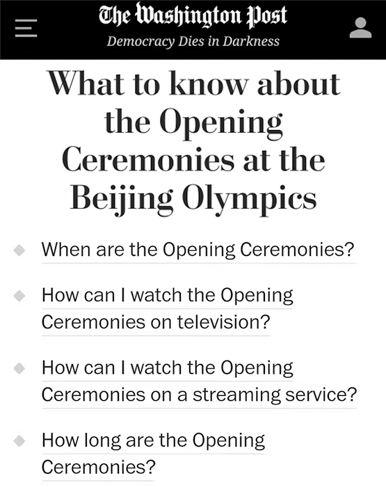 开幕式尚未开始,《纽约时报》《华盛顿邮报》、加拿大广播公司等国际主流媒体就已经做好预热,为海外观众梳理好奥运开幕式时间、时长、观看方式、关注点等。