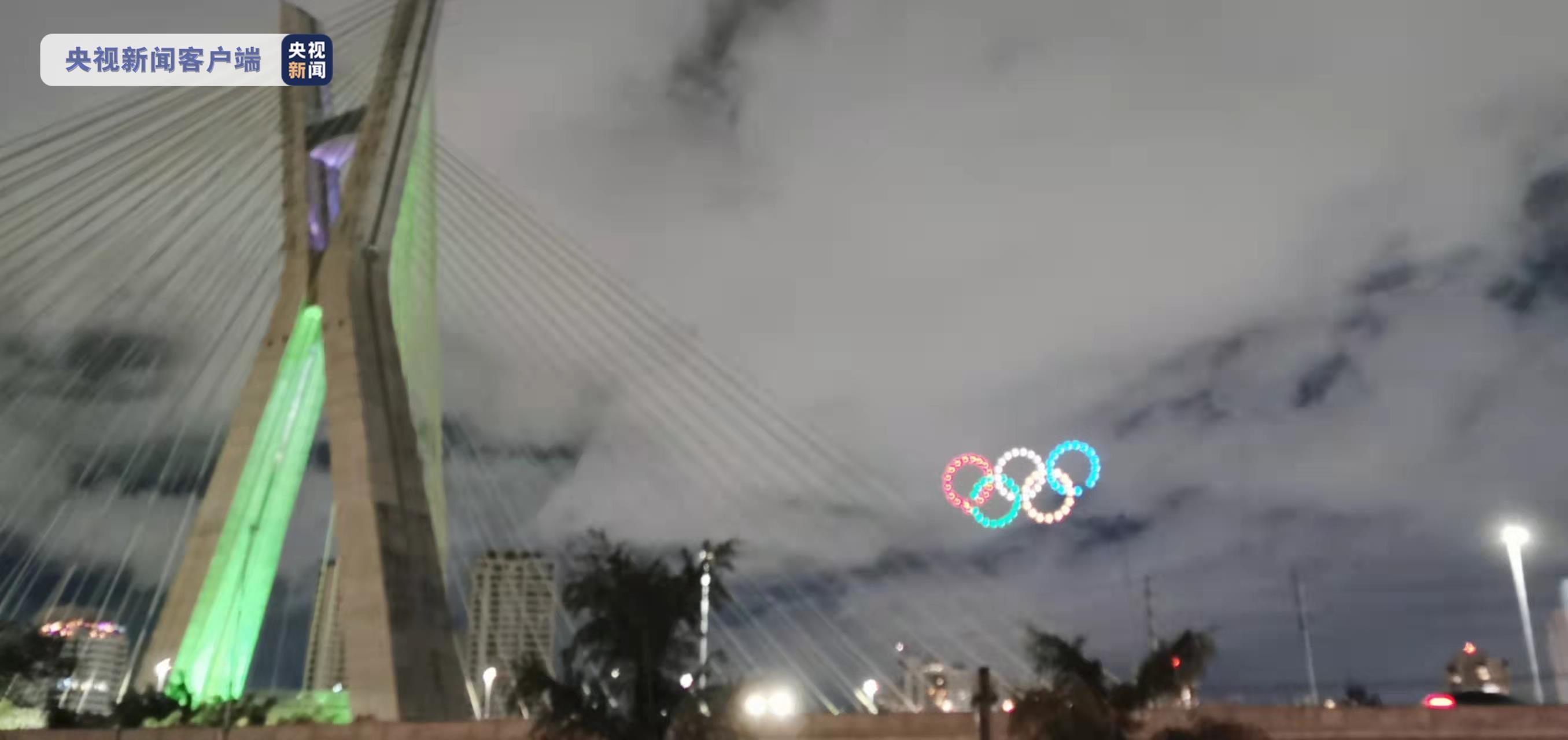 当地时间2月4日晚,巴西圣保罗市地标建筑奥克塔维奥·弗里亚斯·德奥利维拉(Octavio Frias de Oliveira)斜拉桥上空,举行了一场由80架无人机参与的冬奥主题灯光投影表演。