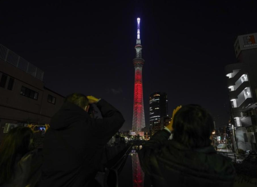 当地时间2月4日晚,日本东京的“天空树”为北京冬奥会点亮红色灯光。