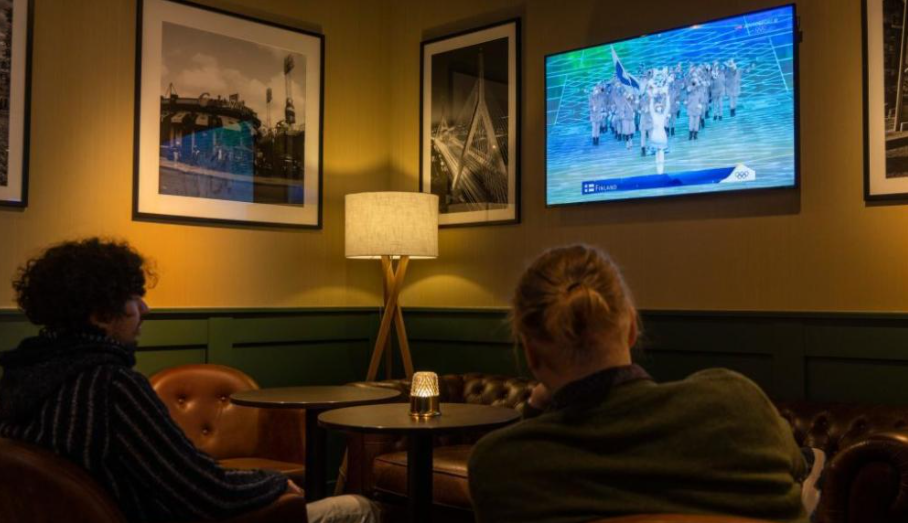 在芬兰赫尔辛基,当地餐厅挂起电视播放开幕式,顾客们看得投入。