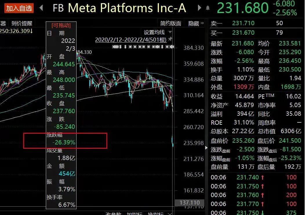 当日,Meta盘前跌幅超20%,盘后跌幅接近23%;市场对其表现出持续悲观,2月3日,Meta市值蒸发2400亿美元,暴跌超过20%,受此影响,扎克伯克的个人财富,一夜损失逼近300亿美元,已经跌出福布斯富豪榜单的前十。