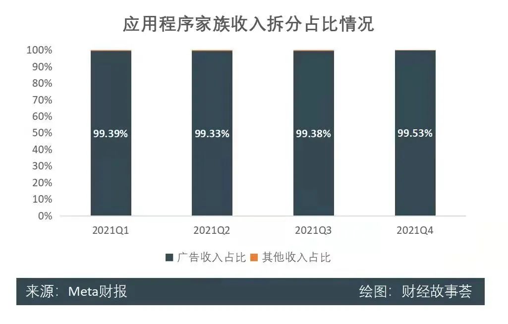 Meta的传统业务盈利方式有两种:一是广告收入,二是其他收入,其中广告收入是大头,贡献占比超过了99%。