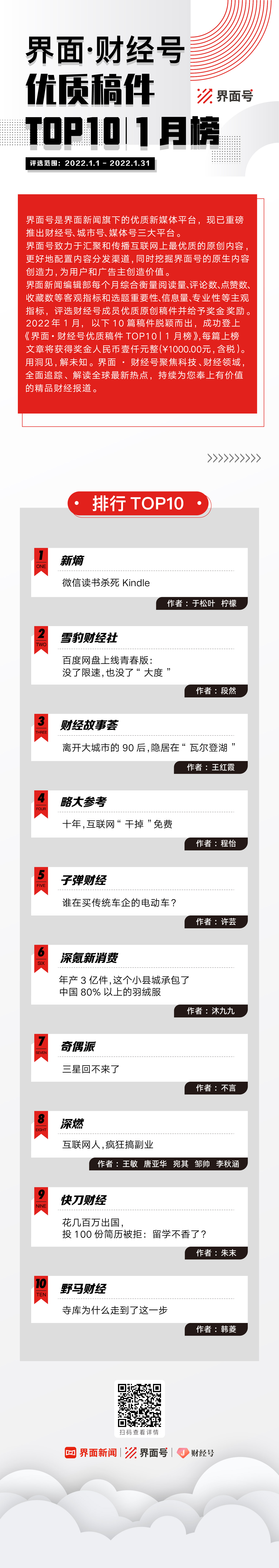 界面·财经号1000多位成员立足于现实生活,持续观察千姿百态的商业现象,破解繁华商业世界背后的秘密,在2022年1月1日至1月31日期间累计发文近2000篇。其中,以下十篇稿件脱颖而出,荣登《界面.财经号优质稿件TOP10|1月榜》(点击标题阅读原文):