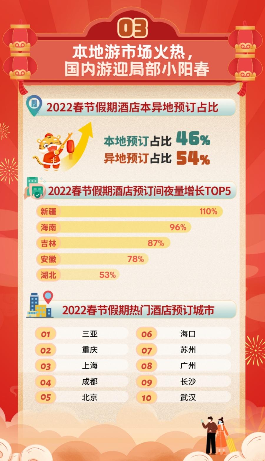 春节期间即将结束,2月6日,同程旅行发布《2022春节假期旅行消费数据报告》(以下简称“报告”)显示,今年春节,“返乡过年”和就地旅行两大主基调并驾齐驱,节前返乡客流较去年增长超过40%,景区、酒店春节预订量增长迅速。返乡探亲客流叠加本地居民出游需求,让春节期间的本地游及周边游市场十分火热。海南、新疆等部分省市迎来了小阳春。