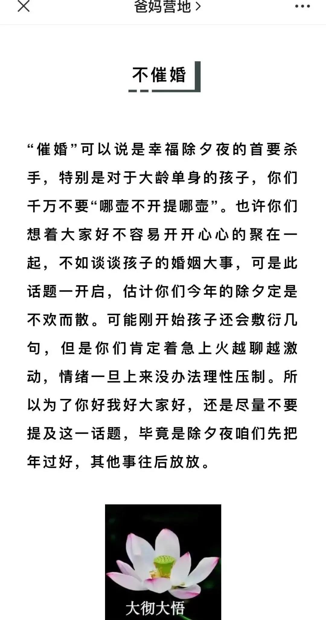 为此,他们各出奇招。有人从小红书和抖音短视频里“取经”,学了一堆“反客为主”的应对话术;有人在豆瓣小组抱团取暖,向互联网另一端的陌生人倾诉烦恼;也有人给父母“私人订制”朋友圈,转发新闻数据表达自己的婚恋观;还有人创办老年人画风、年轻人思想的公众号,“暗度陈仓”反催婚。