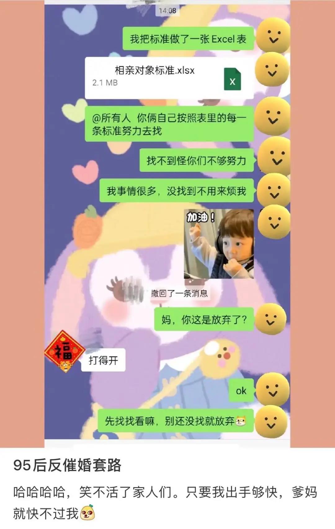 简单来说,就是在父母开始催婚前,积极主动地要求帮忙找对象,甚至拉出一个EXCEL文档,条理明晰地列出相亲对象标准并阐述理由。“既让爸妈觉得自己态度积极,也让他们知难而退,因为很难找到符合条件的人选。”有博主称。