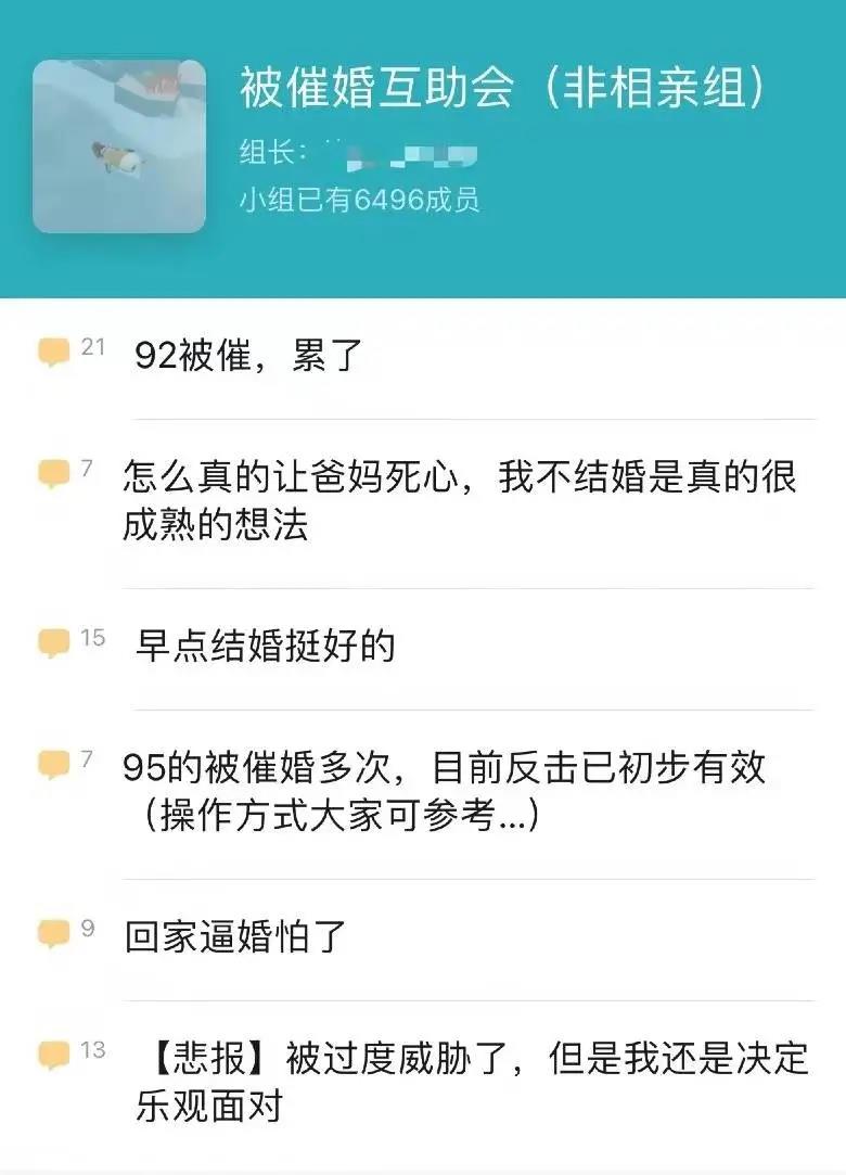 2019年10月,在收到来自妈妈的一条催婚长微信后,澈宁在豆瓣创建了“被催婚互助会”小组。“因为实在被我妈催得太狠了,但是又很害怕和父母起冲突,就想到开个小组,希望和有同样感受的人抱团取暖。”