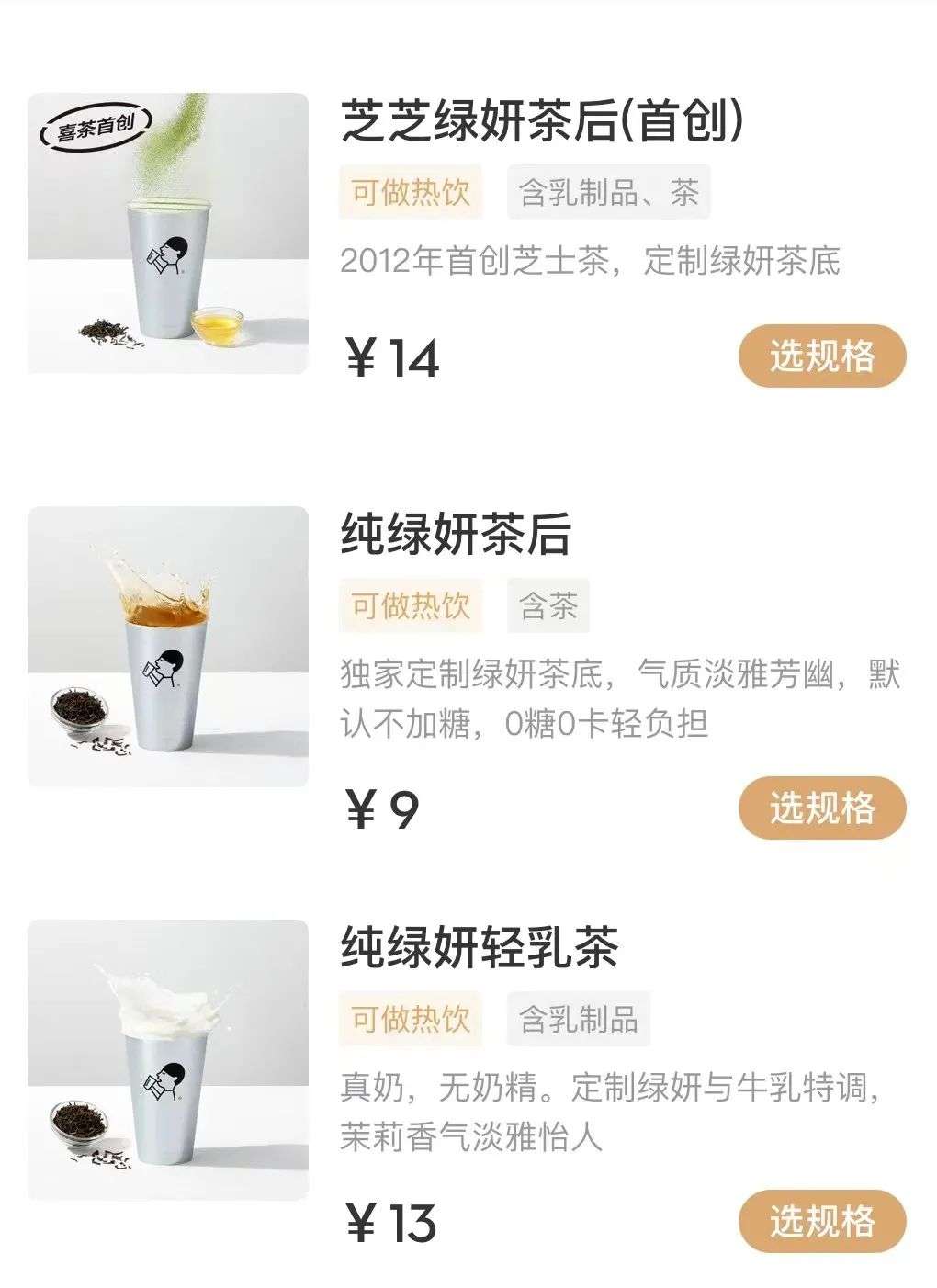 降价幅度最大的是喜茶的纯茶系列,此前售价22元的“芝芝金凤茶王”现下降到18元,最便宜的“纯绿妍茶后”则直接降到个位数——9元。
