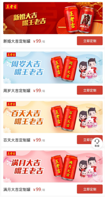 王老吉目前还能满足生日会、婚礼宴席、满月宴席等各种消费场景,细分化定制产品,分别推出新婚大吉、生日大吉、周岁大吉、满月大吉、照片彩印等定制罐。