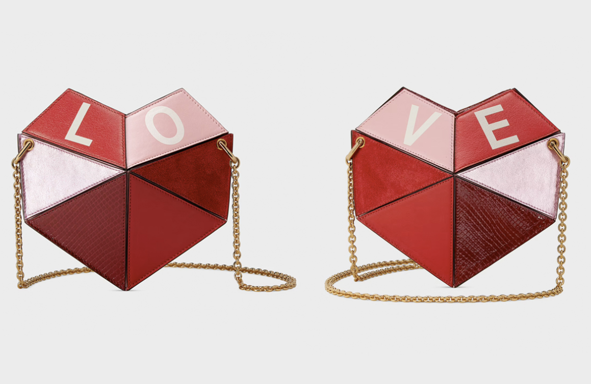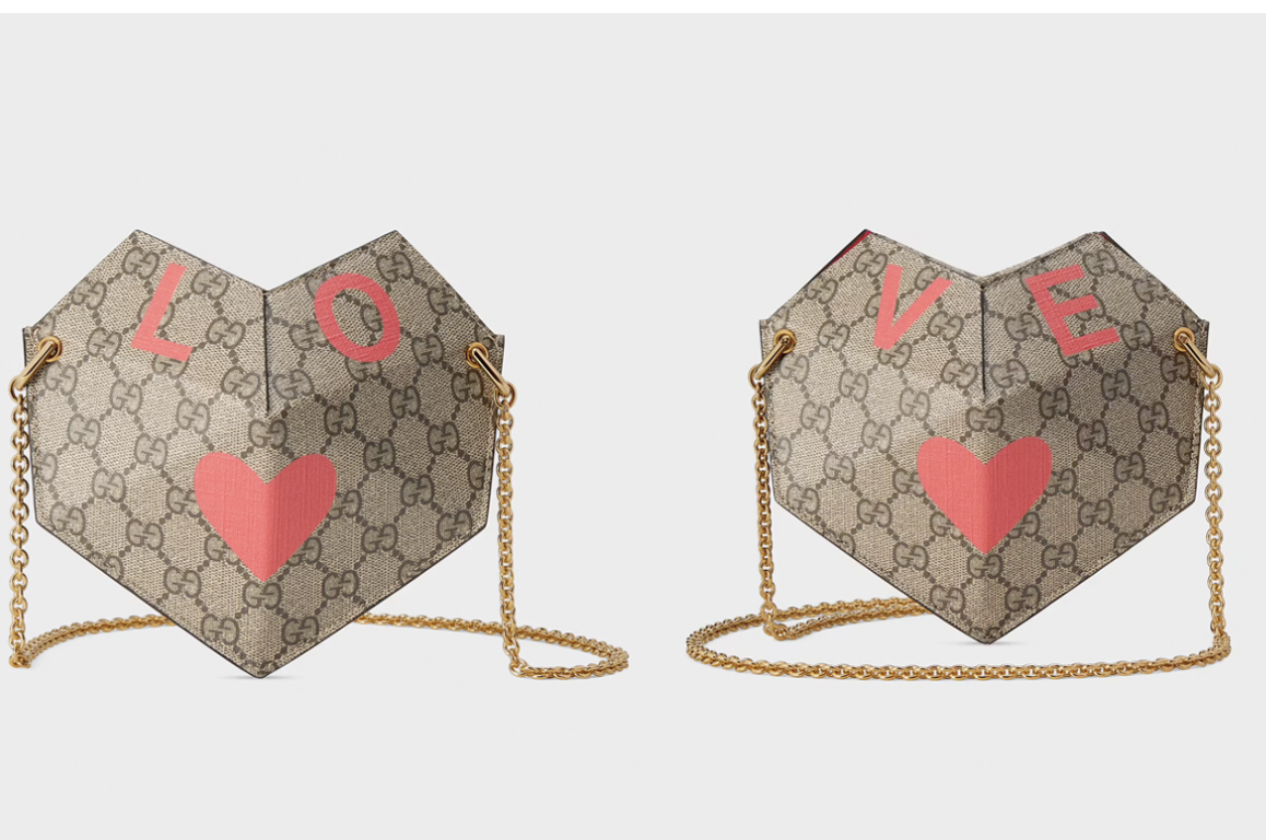 Gucci “Valentine’s Day small heart bag”对手袋爱好者有足够的吸引力,小巧的尺寸和特别的缝纫方式展现出爱心轮廓的立体感,而且轻盈好提,容量适中,正、反面都有L、O、V、E字样,与优雅的金色金属背链相衬,让包款充满甜美可爱的形象。