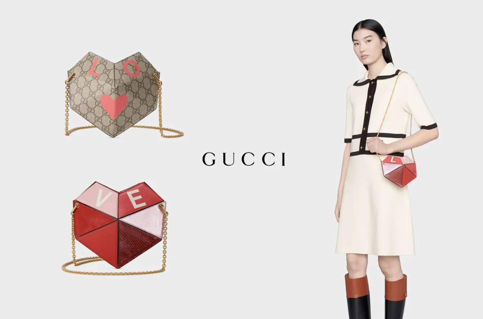 古驰的情人节限定系列直接把爱心造型搬上包袋,裹上粉、玫瑰红、正红的拼接皮革,或是经典GG Supreme图样,以“LOVE”字样搭配,节日氛围感油然而生。